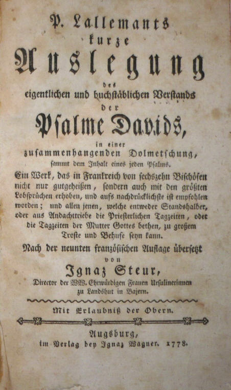 P. Lallemants kurze Auslegung des eigentlichen und buchstäblichen Verstands der Psalme Davids, in einer zusammenhängenden Dolmetschung, sammt dem Inhalt eines jeden Psalms. Ein Werk, das in Frankreich von sechzehn Bischöfen nicht nur gutgeheißen, sondern auch mit den größten Lobsprüchen erhoben, und aufs nachdrücklichste ist empfohlen worden; und allen jenen, welche entweder Standshalber, oder aus Andachtstriebe die Priesterlichen Tagzeiten, oder die Tagzeiten der Mutter Gottes bethen, zu großem Troste und Behuse seyn kann. Nach der